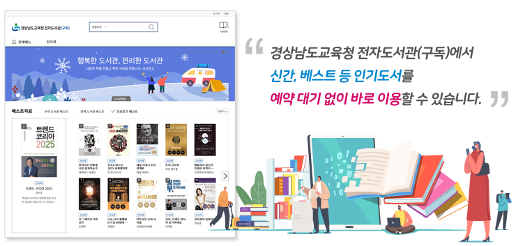 - 좌측 하단의 [도서관검색] 버튼을 눌러 메뉴로 이동 후 ”경상남도교육청 전자도서관(구독)"으로 검색 후 이동